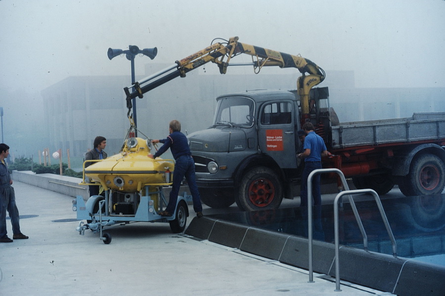 Přemístění ponorky do bazénu pomocí autojeřábu. Ponorka váží 640 kg.