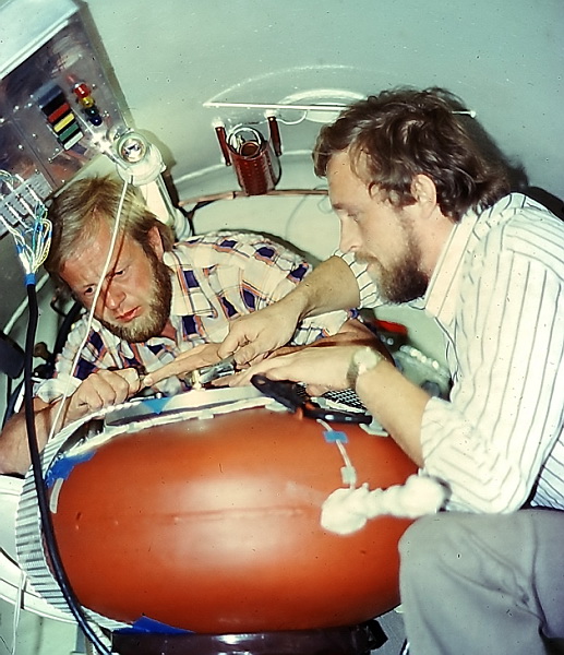 Umístění našeho modelu v tlakové komoře. Model je vybaven zařízením pro měření napětí ve stěně modelu.