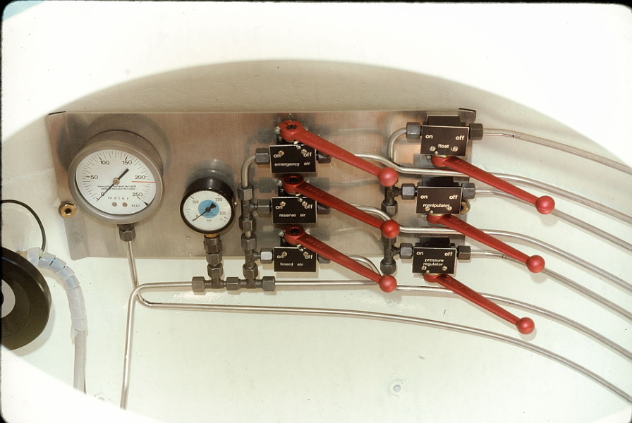 Rozdělovač stlačeného vzduchu. Vlevo hloubkoměr.