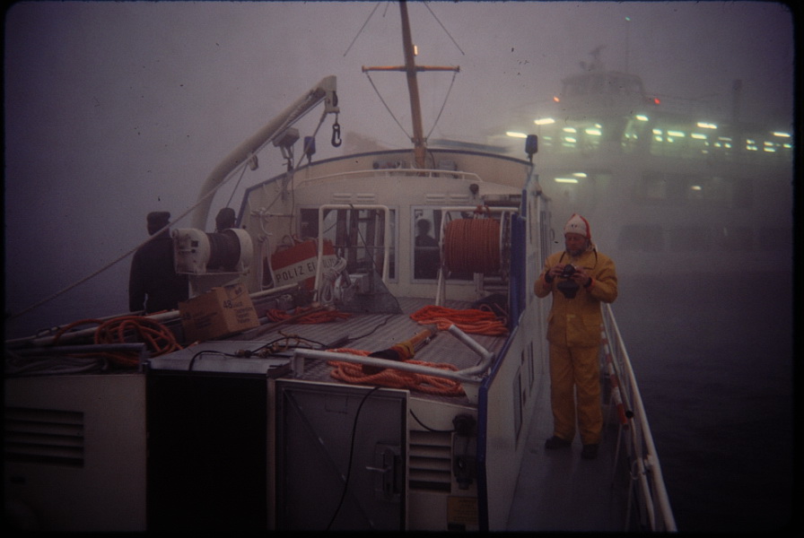 V ranních hodinách na Bodamském jezeře.. V pozadi je trajekt s obrovským autojeřábem na palubě.